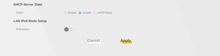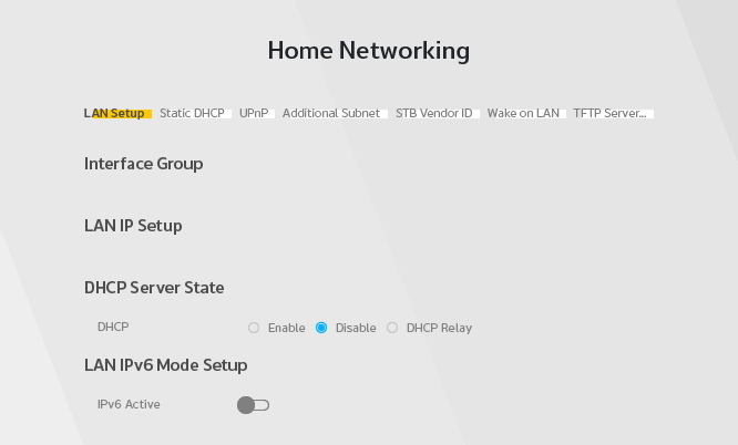 Sæt DHCP Server State til Disable og slå LAN IPv6 Mode Setup fra.