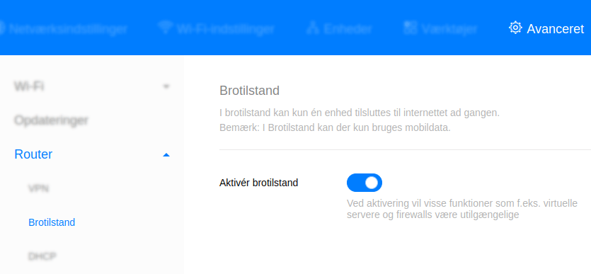 Navigér til Router og derefter Brotilstand, og slå bridge mode til ved Aktivér brotilstand.