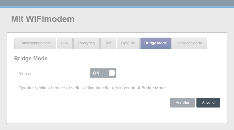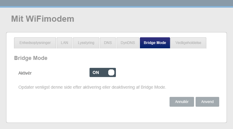 Bridge mode bruges, når du vil deaktivere router-funktionen i dit modem eller modem/router og i stedet bruge din egen router. Det er især relevant, hvis: